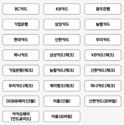 | 케이뱅크(체크) | 하나카드(체크) | DGB유페이(선불) | 이즐(선불) |