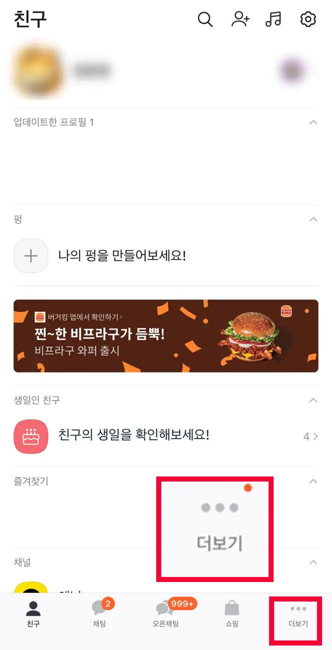 - 카카오톡 앱을 열고, 우측 하단의 '더 보기' 버튼을 클릭합니다.